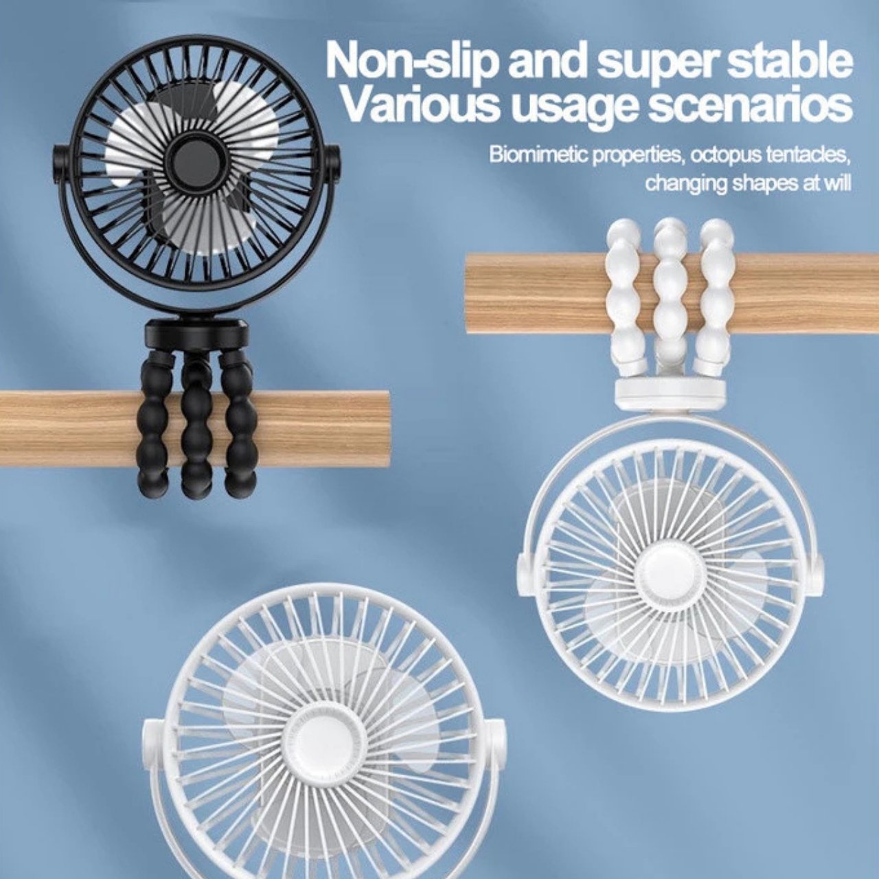 Praktický, tichý a mimoriadne všestranný ventilátor, ktorý vás ochladí kdekoľvek a kedykoľvek! Mini ventilátor s ohybnými nohami vám umožňuje používať ho rôznymi spôsobmi: v ruke, postavený na stole, omotaný okolo vozíka alebo zavesený na zábradlí. Ideálny na doma, do kancelárie, na cestovanie, kempovanie alebo kočík.