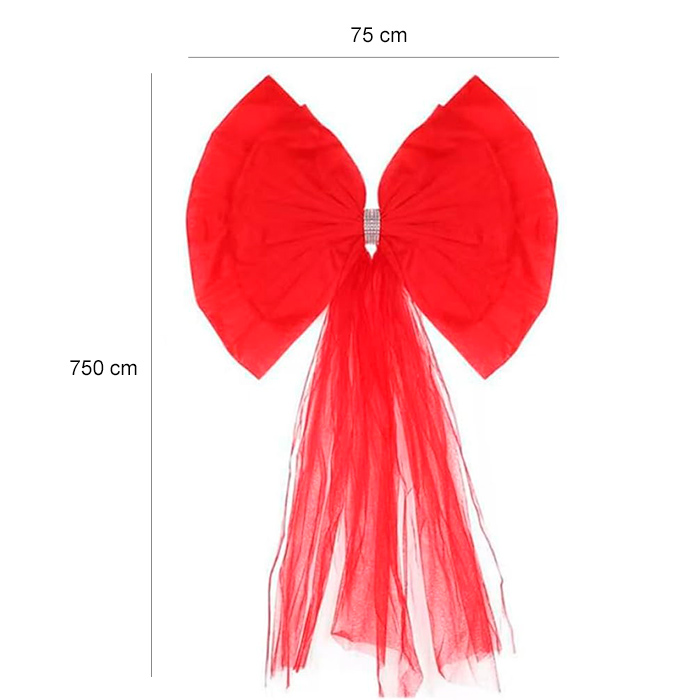750 x 75 cm (celková dĺžka stuhy), 70 x 60 cm (približná konečná veľkosť mašle)